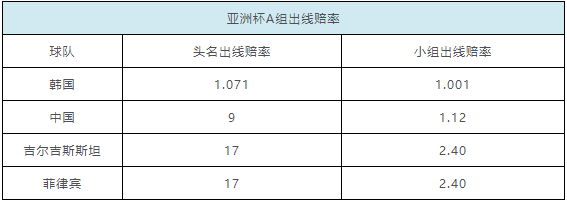 从机构开出的亚洲杯C组出线赔率来看,韩国的出线赔率低至1.001,头名出线赔率同样低至1.071,基本上板上钉钉。中国队的出线赔率为1.12紧随其后,不过小组头名的赔率为1赔9,由此可见和韩国队在实力上有一定差距。第3档球队吉尔吉斯斯坦和第4档球队菲律宾的小组出线赔率为1赔2.4,头名赔率为1赔17,两队的实力差距不大,最重要的还是争取更多积分争夺最好小组第三。(卡沙)