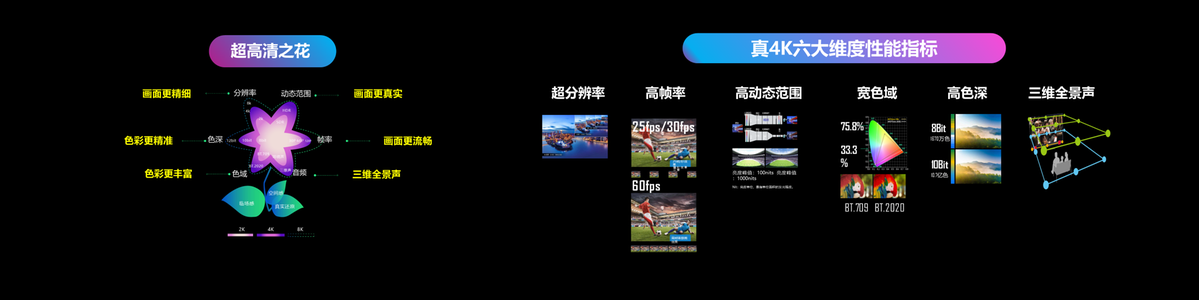 咪咕真4K具有六大技术特色:一是高分辨率,真4K画质将达到3840 X 2160分辨率,这相当于市面上常见1080P的4倍,拉什福德点射命中时的神情一览无余;二是高动态范围,无限模拟真实世界,拓宽色域,让画面色彩更饱实、更鲜明,实现更接近裸眼的观看效果,即使坐在家里也能如临现场般的感受到博格巴与克里斯滕森碰撞时的激烈对抗;三是高帧率,真4K画面每一帧都保持在60帧的高帧率,大大超过当前市面上25帧到30帧的视频直播帧率,使得每一帧画面之间的间隔短至0.02秒,实时还原真实运动轨迹,巴克利禁区弧顶拿球转身调整后的一脚远射毫无拖影;四是三维全景声,从双声道、环绕声升级至三维全景声,真4K使声音更具三维空间感、方位感,曼联球迷的呐喊声如在耳畔;五是宽色域,BT.2020标准几乎涵盖所有自然界物体表面的颜色,色彩更加丰富,将老特拉福德球场现场真实还原在眼前;六是高色深,10bit的高深度数值让渐变色更细腻,打破色彩过渡分层,给球迷们带来更加细腻、流畅、逼真的观赛体验。