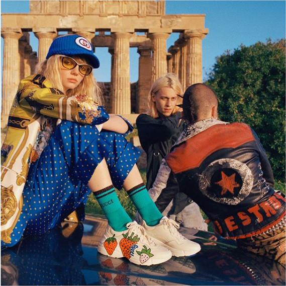 Gucci甚至非常真实的保留了足球袜的最原始造型,只是增加了一个小小的双G Logo,和拖鞋的搭配仿佛还原了足球比赛的更衣室,只不过这次不是大汗淋漓的足球健将,而是惬意的复古女郎。
