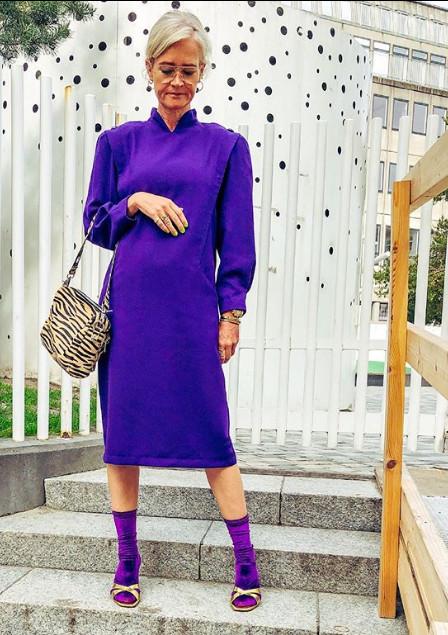 接下来芭姐想给大家安利一位来自丹麦的医学专家Mette Sorrig,这位年过半百的非时装圈出身的丹麦“阿姨”,这次在高定时装周可是强足了菲林,她选择了紫色中式连衣裙搭配堆叠起来的紫色足球袜。谁说老了就不能穿亮色,Mette Sorrig告诉你不管多大都一样走在时髦前线!