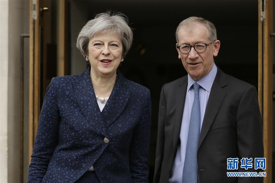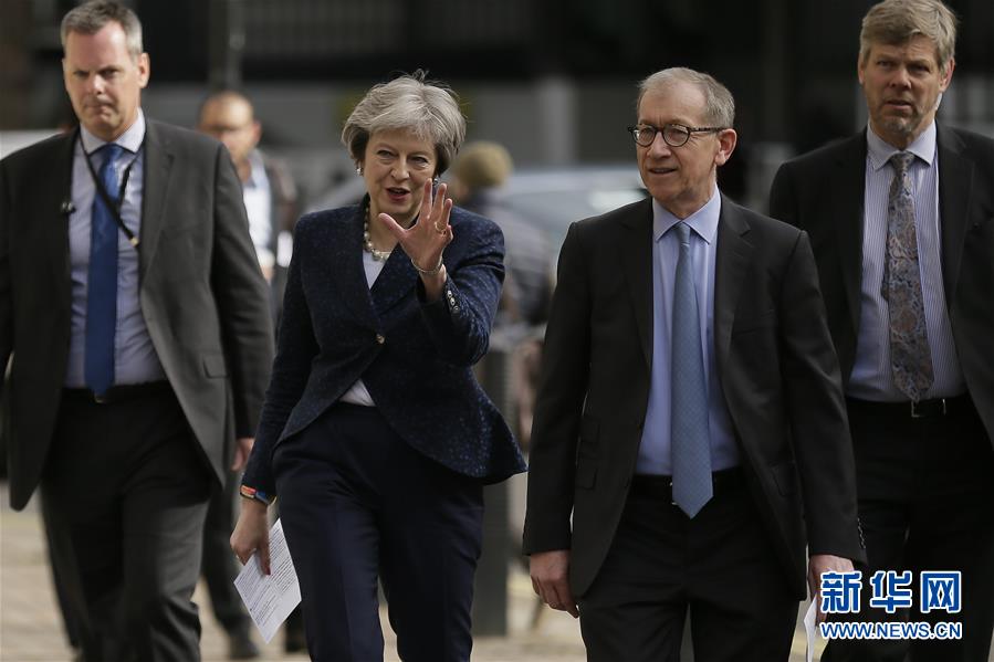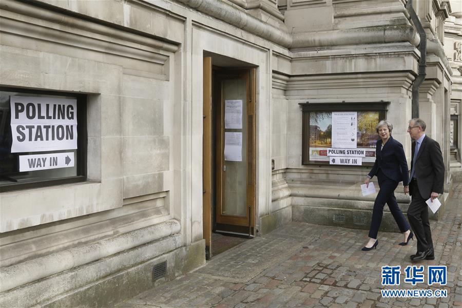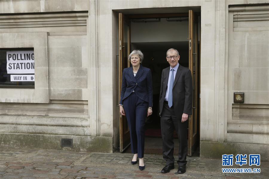 5月3日,在英国伦敦,英国首相特雷莎·梅与丈夫菲利普·梅投票后离开投票站。 当日,英格兰举行地方议会换届选举。新华社发(蒂姆·爱尔兰摄)