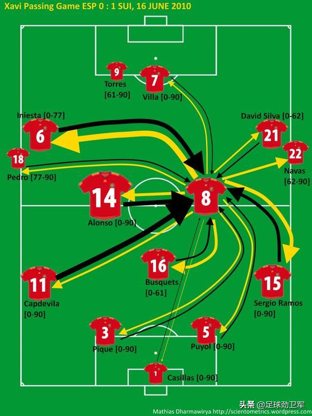 从足球的角度,看完上述分析,您可能对如何评价或者选择教练员,有自己的答案了。看哈维在2010年世界杯对阵瑞士的比赛中的传接球路线图(下面),您看都看花眼了吧?教练赛前布置成这样的还是比赛时教练指挥成这样的?都不可能吧?教练更多的是战略,球员的球商决定了场上的行动。