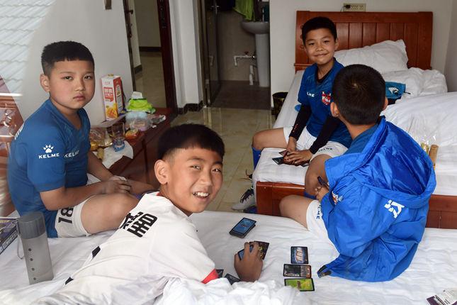 球场上个个生龙活虎,可等到训练结束回到房间,孩子们还是更愿意聚在一起玩游戏。