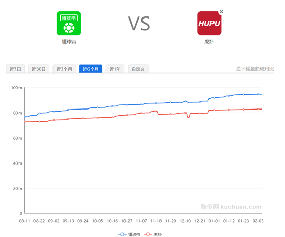 从安卓分发市场下载量上看,懂球帝对比虎扑体育、新浪体育、直播吧等依托于网站的体育综合类应用,在下载量上处于明显劣势,但对比同类型专业足球应用看球啦,有明显优势。