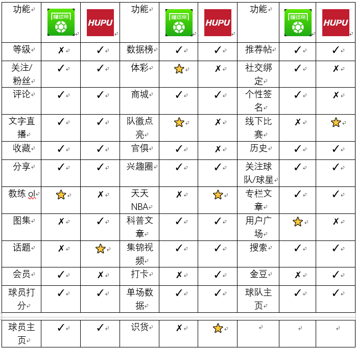 (✓支持功能 ✗不支持功能 ⭐特色功能)