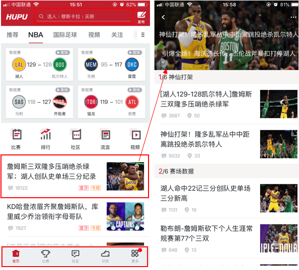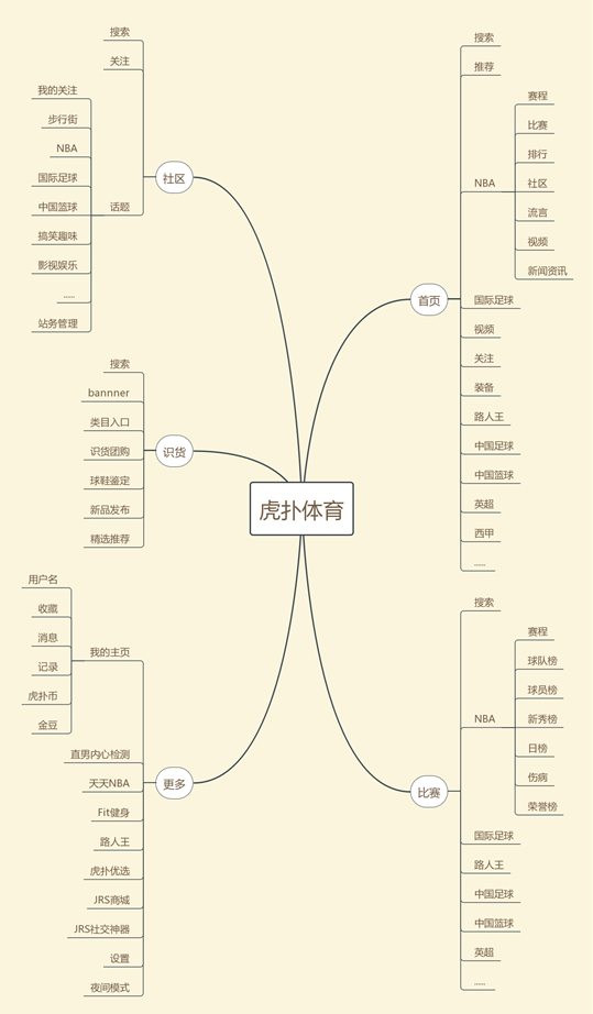 虎扑体育由“首页“、”比赛“、”社区“、”识货“、”更多“五个部分组成,各大版块按功能较为清晰地进行划分。虎扑体育的定位更倾向于满足”资讯+社交“用户的需求,因此可以看出进入首页后为”推荐/NBA“页面,用户可以非常方便地在两个相邻的功能模块间进行切换。而两个重点模块”比赛“+”社区“也可以看出虎扑体育对资讯+社交的并重趋向。虎扑体育通过规范化的运动分类较好地满足资讯类需求,而通过明星效应、官方社交活动、热帖推荐等方式也实现了不断将用户引流向”社交“方向,而大量的发帖量辅之以良好的推荐算法,也保持了用户对于虎扑体育”社交化“功能的粘性。