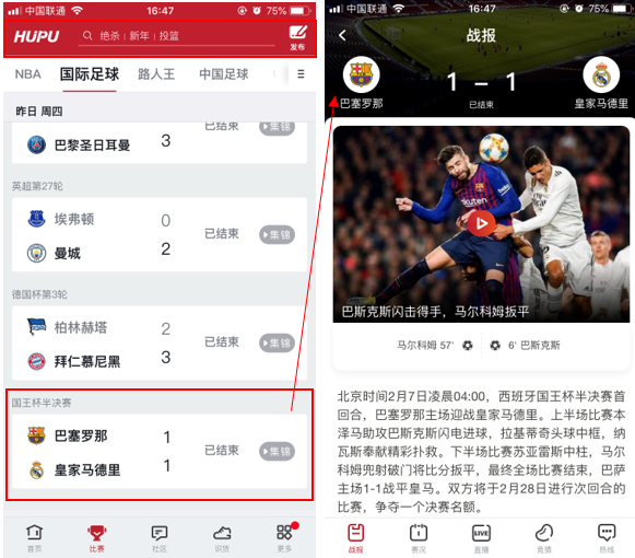 ①懂球帝的赛事分类依据赛事类型区分(即西甲-英超-德甲等);而虎扑体育则按照地域+运动分类。这一区分方法也跟产品的定位是直接相关的,对于致力于深挖足球类资讯的懂球帝而言,区分度更高的赛事分类使得用户可以更好地将目光聚焦在自己感兴趣的单一赛事之上,而虎扑体育兼顾多类运动,为避免分类过于臃肿而选择了地域+运动的形式。