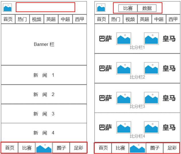②完善首页布局。比如将首页中的“世界“”圈子“模块独立,解决首页同时出现顶部tab和底部tab栏的问题,将”数据“模块取代”比赛“模块中的“比分”模块,而“比分“模块并入”足彩模块进行管理。改动后如图所示。(关键改动已用红框标出)