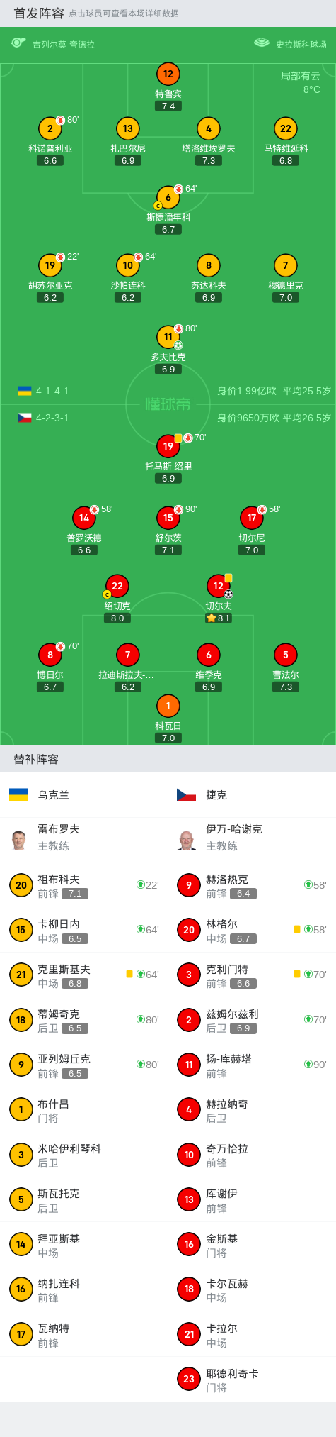 在欧洲国家联赛B级联赛的较量中,乌克兰迎战捷克。上半场,切尔夫破门帮助捷克取得领先。维季克破门,但是因为越位在先被吹无效。下半场,克雷伊奇手球送点,多夫比克点射扳平比分。全场比赛结束,乌克兰1-1战平捷克。