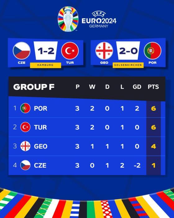 F组中,土耳其队2:1战胜捷克队,成功晋级淘汰赛。格鲁吉亚队爆冷2:0战胜提前锁定小组第一的葡萄牙队,抢得一个晋级名额,他们首次参加大赛即小组出线。