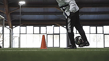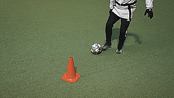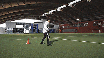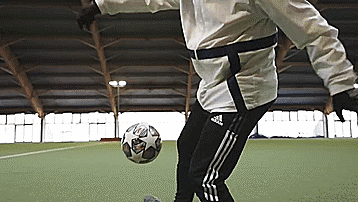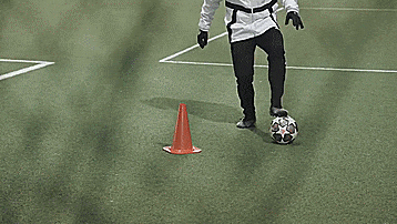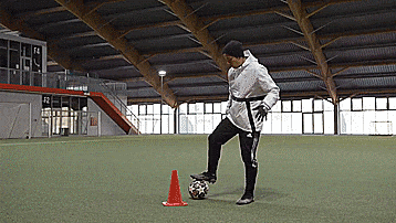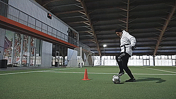 把脚放脚在球上开始,用向外环绕地球将球滚回朝向弱侧的膝盖,用我们的膝盖内侧把球拍向我们惯用的一侧,做一个膝盖AKKA。