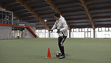 从我们的脚踩在球上开始,把球拉向我们的弱势脚,现在把我们惯用脚放在地上。