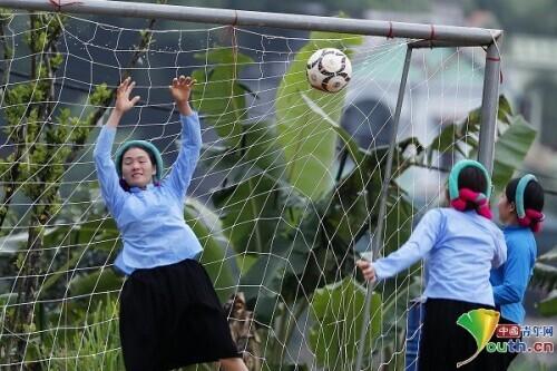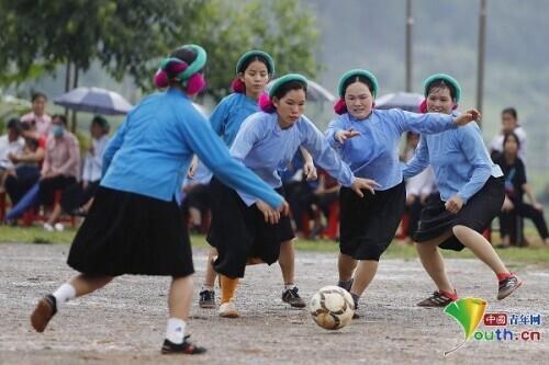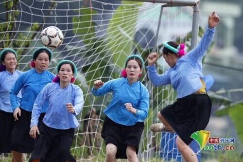 当地时间2021年4月25日,越南广宁省,身穿传统服装的San Chi族女子在足球比赛中玩耍,这是越南节日Soong Co节的一部分。这场比赛吸引了数百名观众。所有14名球员都身着传统服装,身穿蓝色长袖衬衫、黑色短裙,头戴发带。