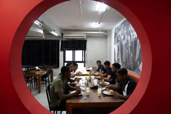 3月6日,球员在弗拉门戈俱乐部青训基地食堂用餐。新华社记者 王天聪 摄