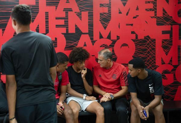3月6日,教练(右二)与球员们在弗拉门戈俱乐部青训基地交流。新华社记者 王天聪 摄