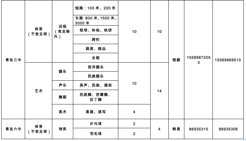 此外,青岛高新职业学校计划招收体育特长生15人;青岛启迪中学计划招收体育特长生7人,艺术特长生8人;私立青岛天龙中学招收体育2人,艺术6人;青岛启明星中学招收体育3人,艺术12人;青岛大学附属中学(高中)招收艺术特长生12人;青岛格兰德中学(高中部)招收体育6人,艺术8人。