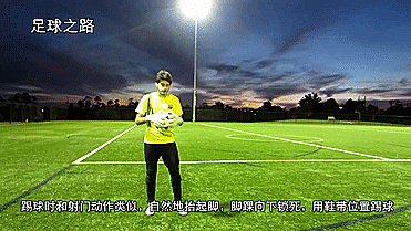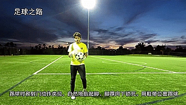 踢球时和射门动作类似,自然地抬起脚,脚踝向下锁死,用鞋带位置踢球。