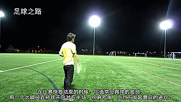 在比赛快要结束的时候,你通常会踢球的底部,用一个大脚径直将球开向对方半场,吹响号角,向对方发起最后的进攻。