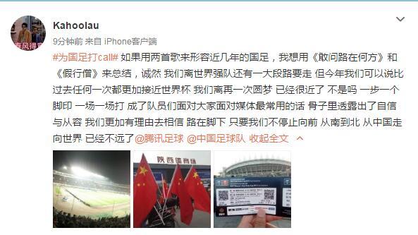 @Kahoolau #为国足打call#如果用两首歌来形容近几年的国足,我想用《敢问路在何方》和《假行僧》来总结,诚然 我们离世界强队还有一大段路要走 但今年我们可以说比过去任何一次都更加接近世界杯 我们离再一次圆梦 已经很近了 不是吗 一步一个脚印 一场一场打 成了队员们面对大家面对媒体最常用的话 骨子里透露出了自信与从容 我们更加有理由去相信 路在脚下 只要我们不停止向前 从南到北 从中国走向世界 已经不远了@腾讯足球@中国足球队