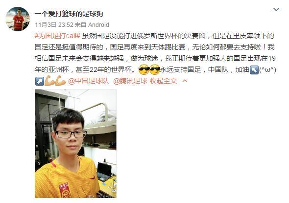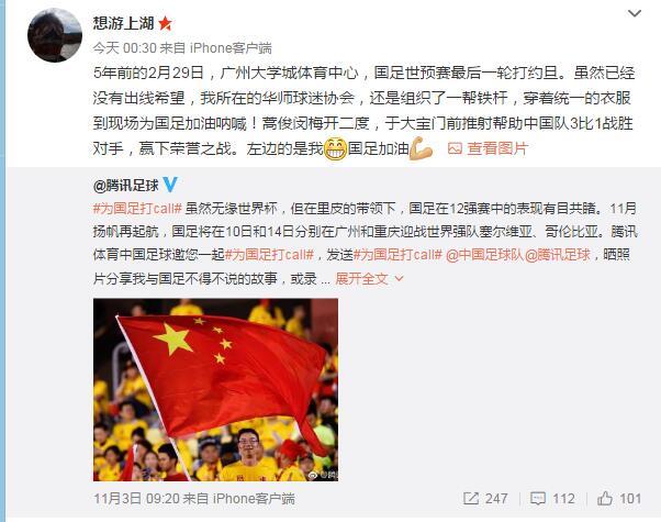 腾讯中国足球发起#为国足打call#的活动,吸引了一大批的球迷网友前来参与,分享了很多让人感动的故事。在活动的第二天河第三天,球迷为国足助威的热情并没有减少。