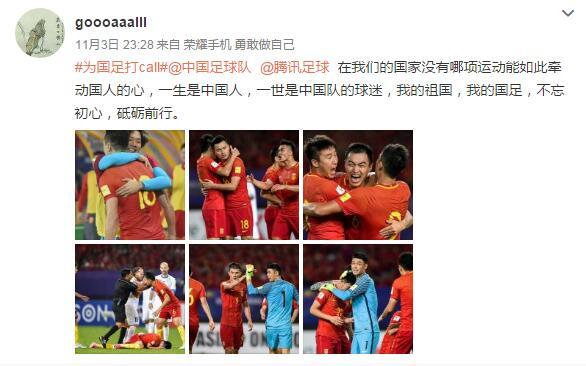 @goooaaalll #为国足打call#@中国足球队@腾讯足球在我们的国家没有哪项运动能如此牵动国人的心,一生是中国人,一世是中国队的球迷,我的祖国,我的国足,不忘初心,砥砺前行。