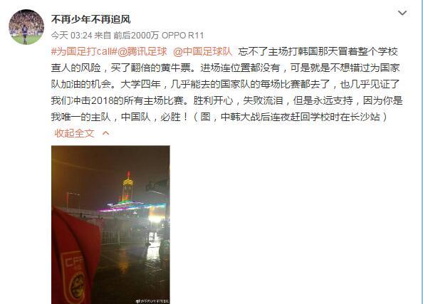 @不再少年不再追风 #为国足打call#@腾讯足球@中国足球队忘不了主场打韩国那天冒着整个学校查人的风险,买了翻倍的黄牛票。进场连位置都没有,可是就是不想错过为国家队加油的机会。大学四年,几乎能去的国家队的每场比赛都去了,也几乎见证了我们冲击2018的所有主场比赛。胜利开心,失败流泪,但是永远支持,因为你是我唯一的主队,中国队,必胜!(图,中韩大战后连夜赶回学校时在长沙站)