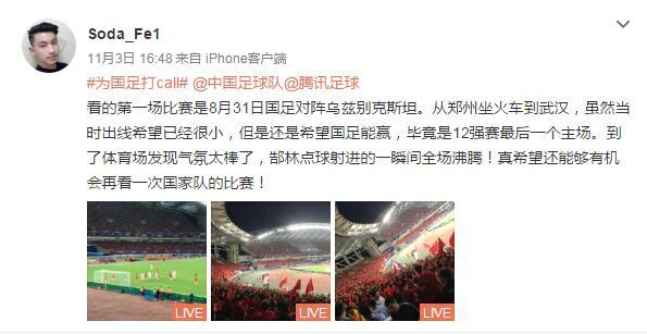 @Soda_Fe1 #为国足打call#@中国足球队@腾讯足球看的第一场比赛是8月31日国足对阵乌兹别克斯坦。从郑州坐火车到武汉,虽然当时出线希望已经很小,但是还是希望国足能赢,毕竟是12强赛最后一个主场。到了体育场发现气氛太棒了,郜林点球射进的一瞬间全场沸腾!真希望还能够有机会再看一次国家队的比赛!