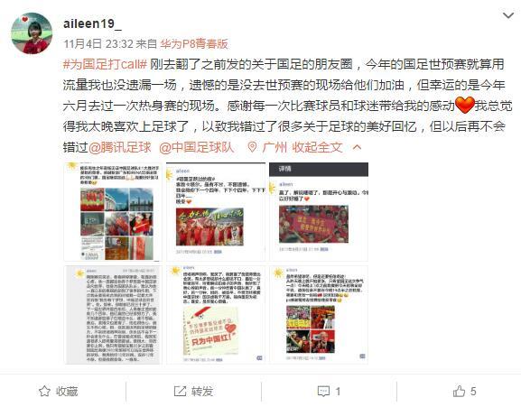 @aileen19_#为国足打call#刚去翻了之前发的关于国足的朋友圈,今年的国足世预赛就算用流量我也没遗漏一场,遗憾的是没去世预赛的现场给他们加油,但幸运的是今年六月去过一次热身赛的现场。感谢每一次比赛球员和球迷带给我的感动我总觉得我太晚喜欢上足球了,以致我错过了很多关于足球的美好回忆,但以后再不会错过@腾讯足球@中国足球队