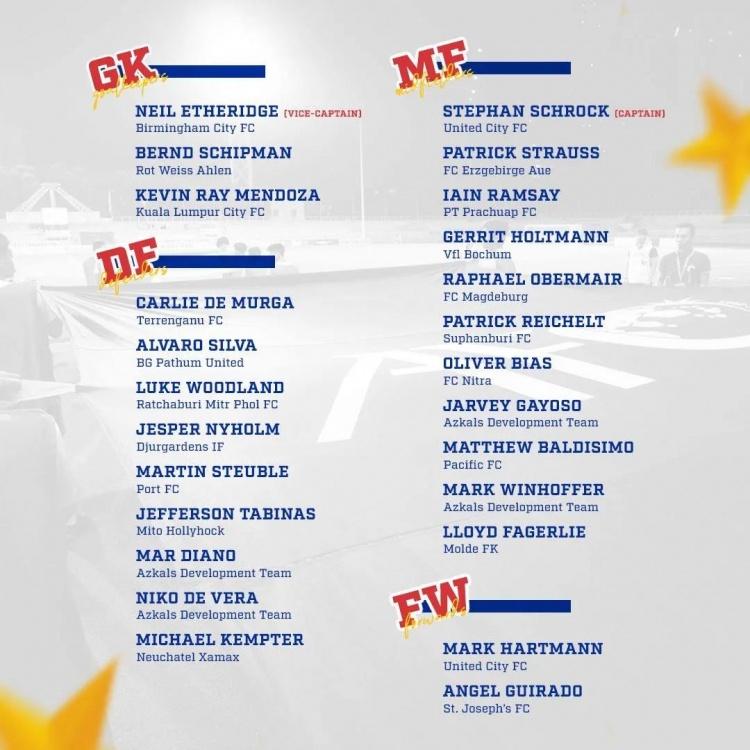 中场:施罗克(联合城/菲律宾)、文霍费尔(菲律宾发展队)、赖歇尔特(素攀武里/泰国)、迈克-奥特(联合城/菲律宾)、曼努埃尔-奥特(马六甲联/马来西亚)、盖奥索(菲律宾发展队)、健次郎-丹尼尔斯(卡雅/菲律宾)、奥利弗-比亚斯(尼特拉/斯洛伐克)