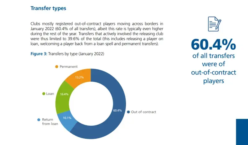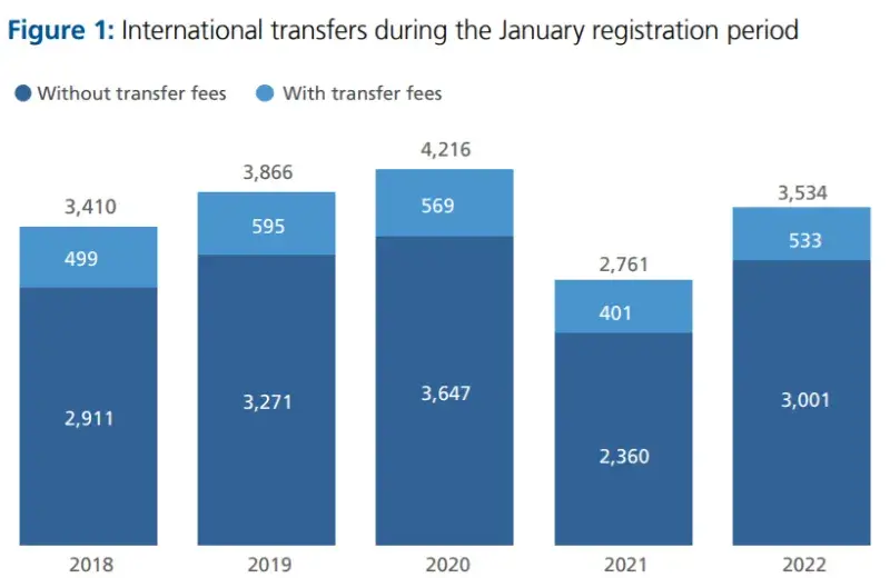 而聚焦男足 的话,在这个冬窗国际市场共录得3534笔转会 ,比去年同期的2761笔转会要增长了28% ,逼近疫情前的水平(4216笔转会)。