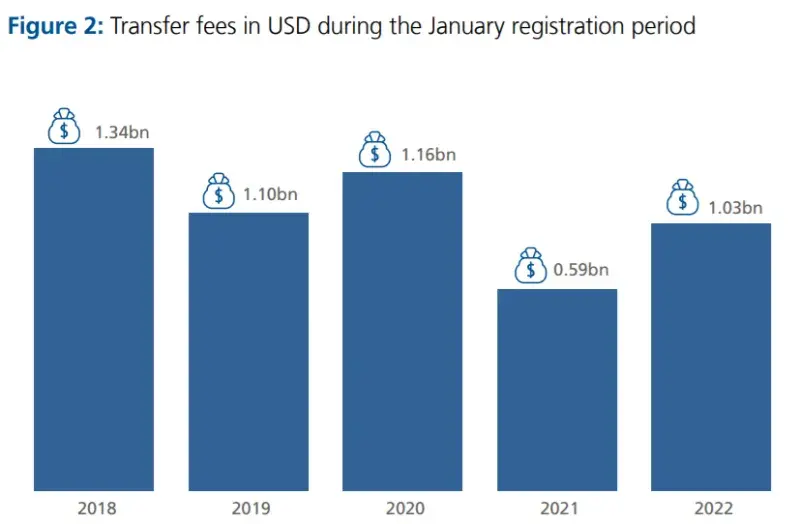 虎扑02月08日讯 国际足联(FIFA)公布了2022年1月国际转会窗的总结报告。根据这份报告,在这个转会窗,全球共完成了3791单转会,转会支出方面的水平接近回归到2020年1月,也就是疫情前的水平。
