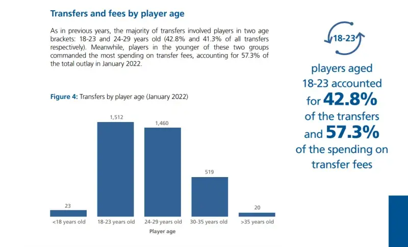 而在球员的年龄方面,18-23岁和24-29岁年龄段的球员依旧是市场上最为吃香的,分别占到了全年龄段转会数量的42.8%和41.3%。支出方面,则是18-23岁年龄段的球员花费最高,总额为5.895亿美元,占到了总转会额的57.3%,而24-29岁球员的总转会花销3.935亿欧。
