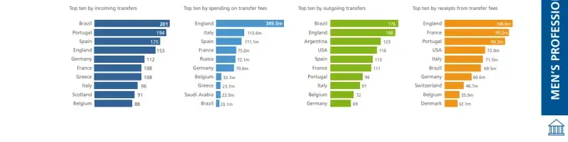 而到了比较各国足球市场的活跃度方面,巴西以201笔转入和176笔转出雄踞两份榜单的头名。而在转会收入和转会支出前十的国家中,英格兰则是分别以1.086亿和3.495亿占据榜首。