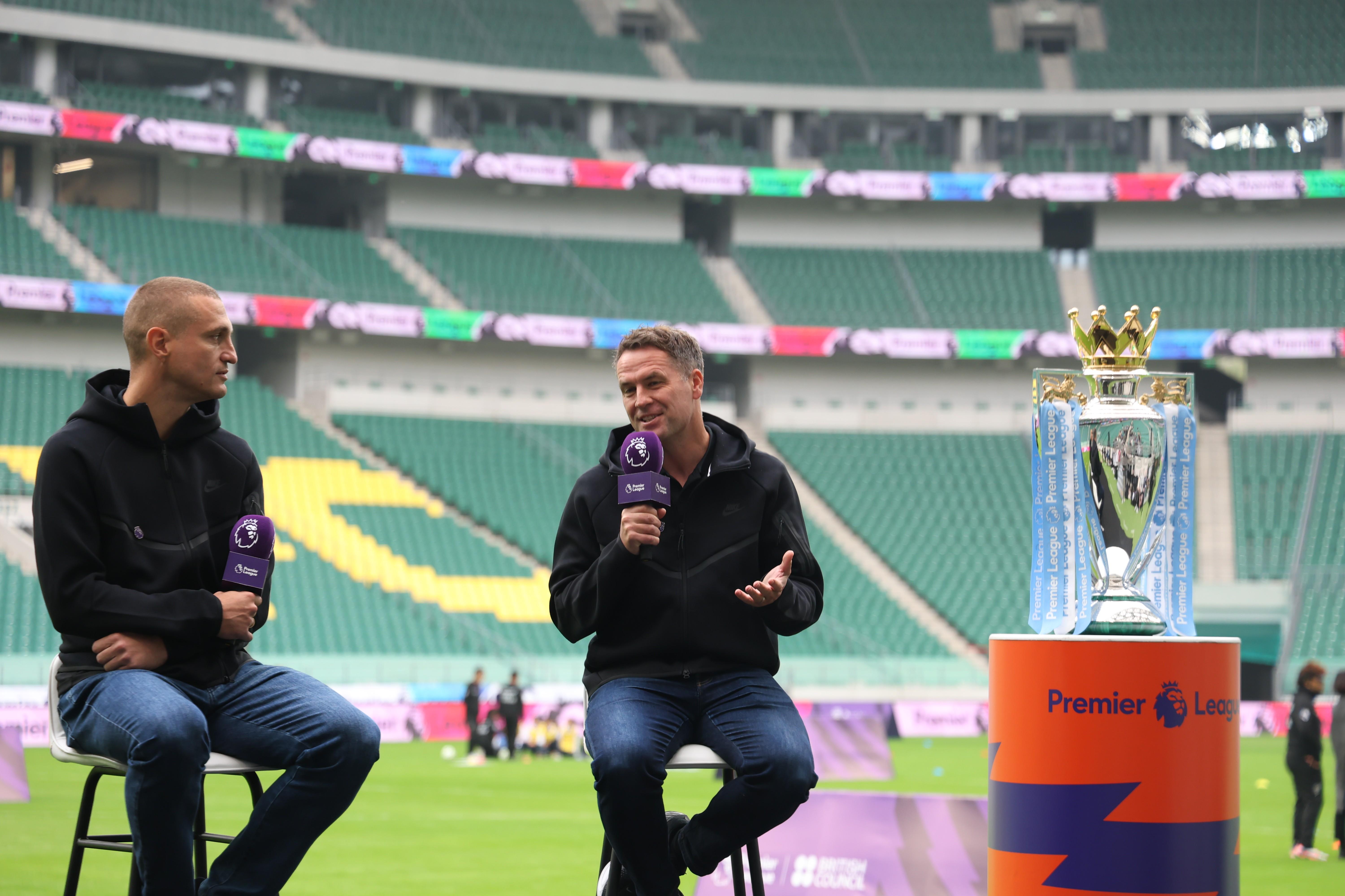 直播吧10月17日讯 北京时间10月17日,英超联赛在北京工人体育场举办基层足球展示活动。前英超球员迈克尔-欧文、维迪奇和孙继海莅临现场,在媒体问答环节中接受直播吧采访。