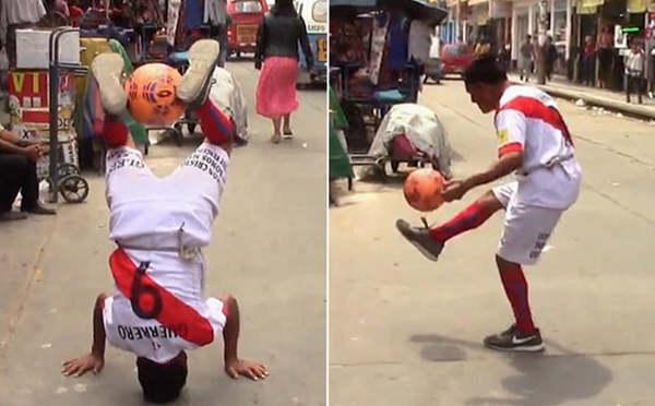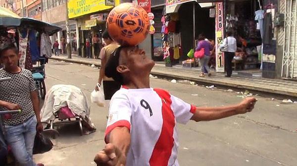 现年85岁的费利西亚诺•马特尔(Feliciano Martel)在秘鲁中部城市瓦努科街头穿着本国国家队球员保罗•格雷罗(Paolo Guerrero)的同款9号球衣,娴熟而灵活地表演起各类花式颠球技巧,尽情展现自己的足球才华。只见他头手倒立,用双腿将足球轻巧地稳稳夹住;随后又在上身保持平衡的情况下,将足球在双脚间灵敏地上下移动,仿佛只是一个年仅16岁的青春少年。更精彩的是,他甚至还在热情的拉美音乐伴奏下一边跳舞,一边让足球在自己的头部和肩部保持平衡。