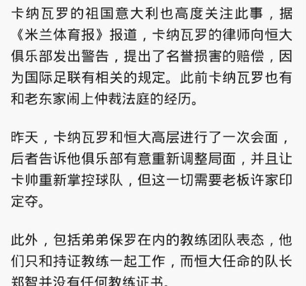 目前恒大由郑智代行主教练指责,郑智没有教练资格证书,但粤媒称,恒大已经召开内部会议,宣布郑智会以执行主帅身份带队直至赛季结束。不过卡帅的弟弟小卡纳瓦罗声称自己不会跟没有教练证书的人共事。