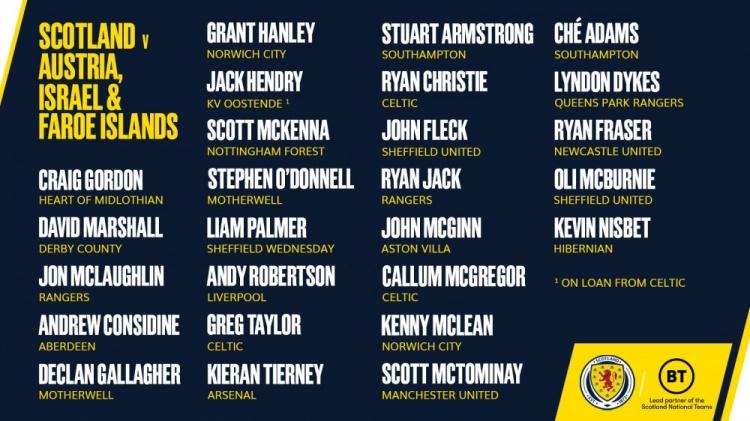 苏格兰将在10月的国际比赛日迎战克罗地亚和葡萄牙,名单如下: