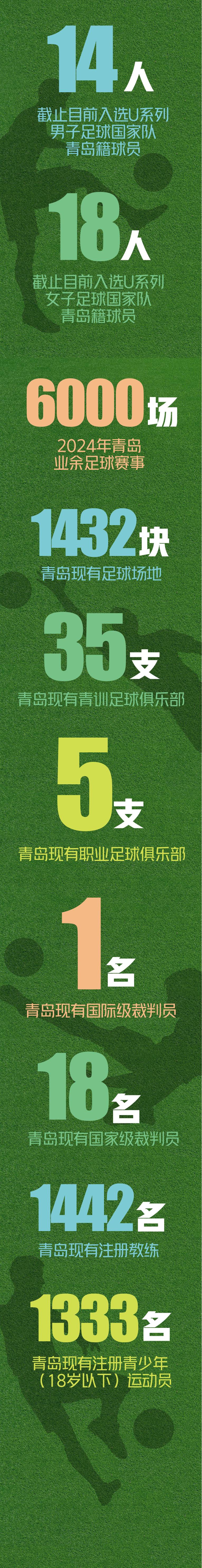 ●青岛市每年开展的各类足球赛事达30余项,市级群众性足球赛事超过5000场,全市常年参与足球活动人口达50余万人(青少年30余万人)。“市长杯”校园足球联赛至今已连续举办35届,全市校园足球特色学校达400所,其中,236所学校被教育部授予“全国青少年校园足球特色学校”称号