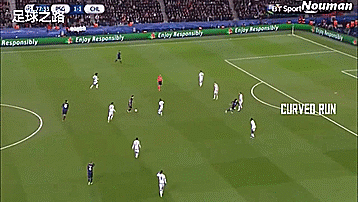 我们在仔细看一遍过程,现在防线后、中后卫和边后卫之间都有空间,卡瓦尼通过曲线跑位将其占据,通过这种瞬间的跑位扰乱对方的防守。