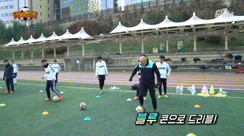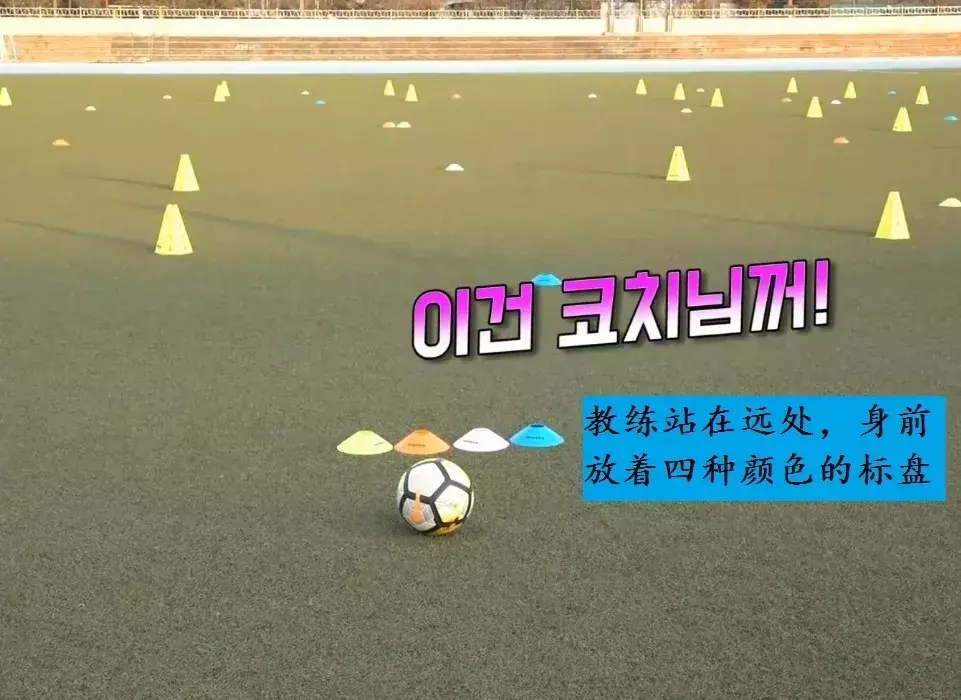 教练会随机拿起身前的标盘。如果教练拿起“蓝色”的标盘,球员们就需要带球绕身边的蓝色标盘一圈。