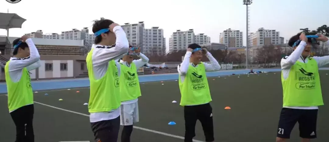 球员们做分组对抗,但背心的颜色却是一样的。精髓就在于发带的颜色。