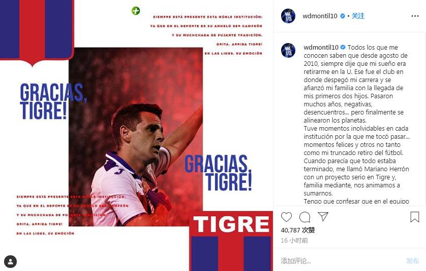 蒙蒂略今日在个人社交媒体上发文,他说:“认识我的人都知道,从2010年8月以来,我的梦想就是回到智利大学队退役,这是我事业开始腾飞的地方,也是我两个孩子出生的地方。这么多事情过去了,事情终于回到了正轨。”