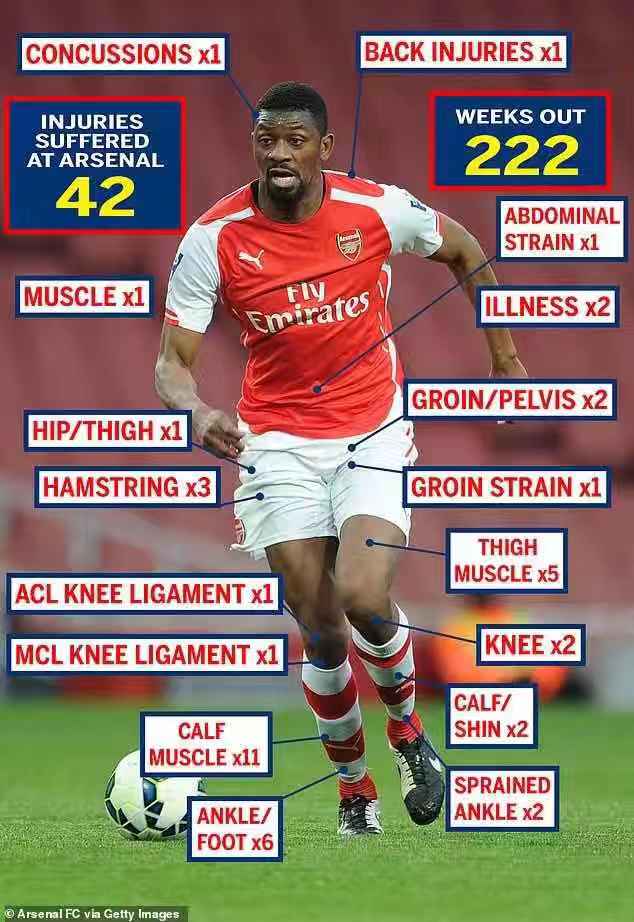 数据显示,效力阿森纳期间,迪亚比因伤病缺席了整整1937天,相当于有一半以上的时间都在养伤。