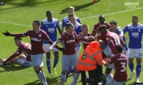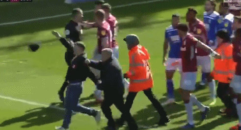 球场安保人员也迅速冲入场内,将肇事球迷控制住。维拉球员不干了,阿布拉汉姆、尼尔-泰勒、霍里哈内3名球员冲过来,准备暴揍这位球迷! 维拉的格伦-惠兰、明斯也冲了过来,拦住冲动的队友们,避免事态进一步朝着恶化的方向发展而去。