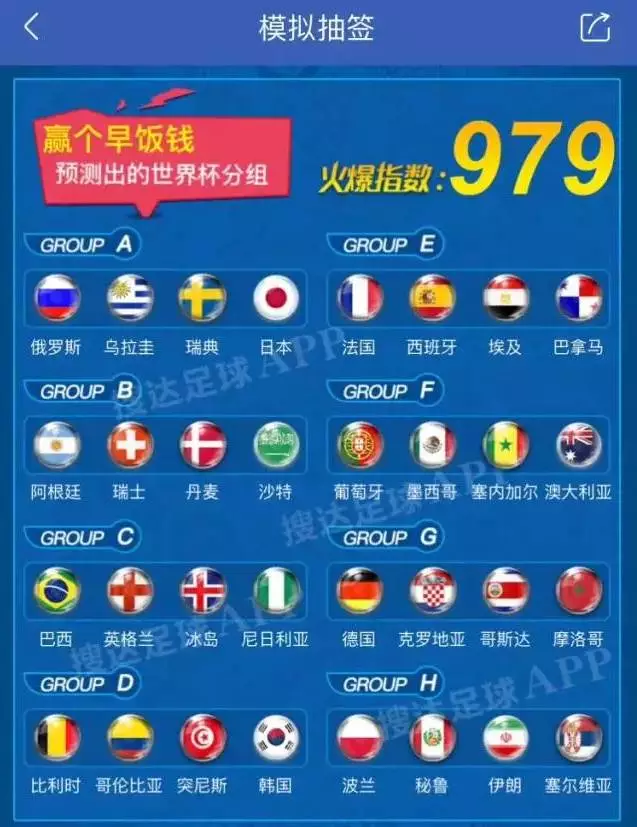 12月1日,将进行2018世界杯分组抽签。下载搜达足球APP,体验一把世界杯模拟抽签。由你亲自抽出8个小组,得到一个火爆指数,点击排行榜,可查看你的火爆指数排名。排名靠前的用户将获得大力神杯100mm礼盒装、大力神杯70mm摆件等奖品。