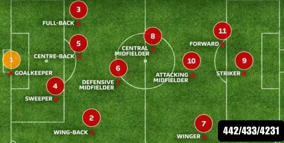 当今足坛几乎所有阵型都能用下图的阵型站位和场上职能说明。如: