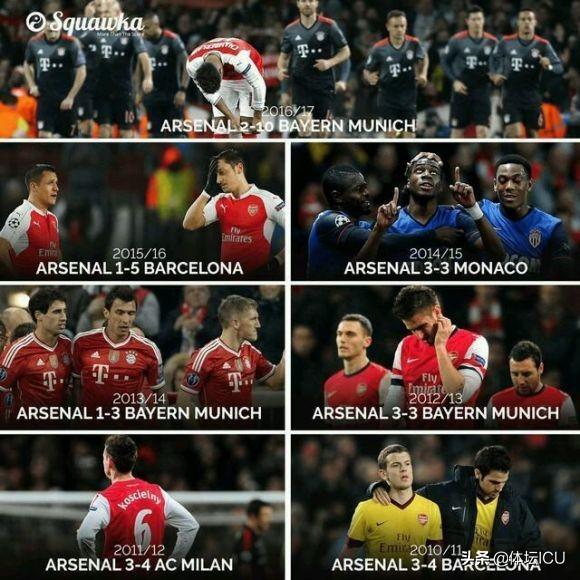 “踢巴萨,踢拜仁慕尼黑,我厂已崩”。关注阿森纳的球迷对这段欧冠主题歌一定不会陌生。从2010/11赛季到2016/17赛季的连续七年时间里,阿森纳在欧冠小组出线后两次遇到巴塞罗那,三次面对拜仁慕尼黑的比赛中全部败北,更是在这7个赛季的欧冠联赛中全部止步16强。于是在球迷圈子中便有了“五年巴萨,三年拜仁”的名梗和“小组出线稳如狗,年年出现打宇宙”的说法。