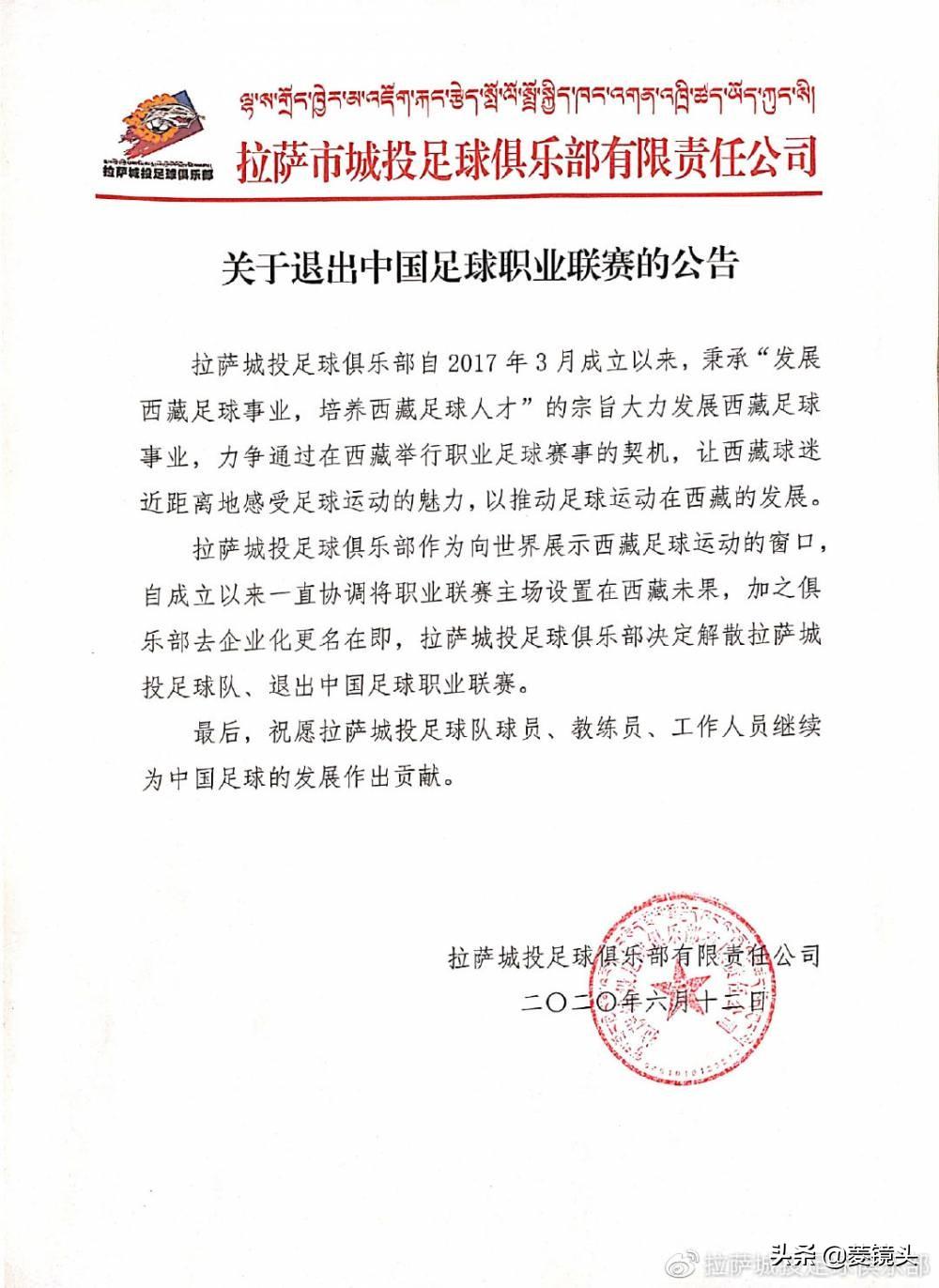 就在其余中乙球队终于看到乙级联赛开赛曙光的时候——中超联赛预计7月中旬以赛会制形式启动,乙级联赛也将随后开启这个特殊的新赛季——两个月前还雄心勃勃希望能在今年乙级联赛完成“冲甲”重任的拉萨城投,6月4日下午下发了一份改变球队命运的通知,“宣布一线队解散”,一来一去,中国足球职业联赛最底层的浪花又被卷走一朵。