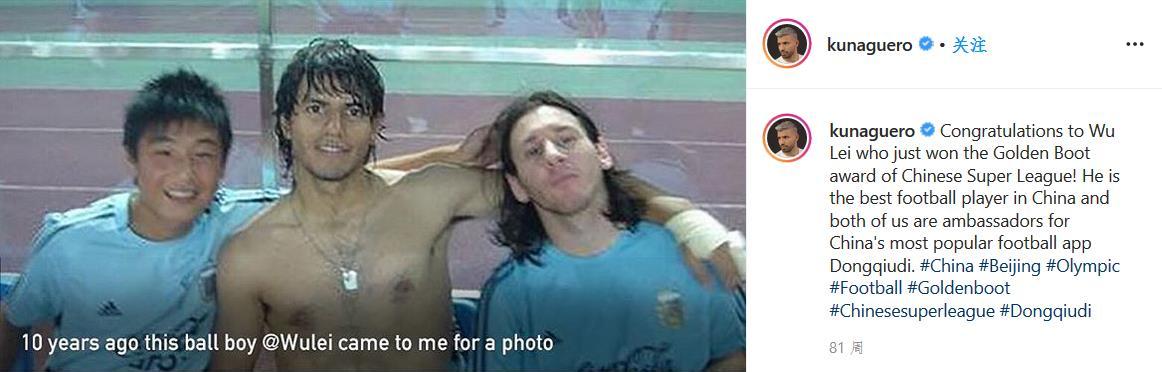 实际上,1991 年出生的武磊 2008 年夏天很快就满 17 岁了。后来,阿奎罗也在自己的社交账号上贴出了这张照片,并祝贺武磊获得 2018 赛季中超金球奖。但对中国联赛和中国球员,阿奎罗的了解并不丰富,更多的还是靠他在中国踢球的同胞。