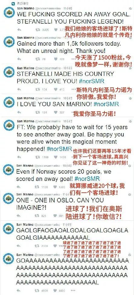 对于圣马力诺球员来说,进球与拿分的快乐难以想象,看看圣马力诺官推的小编多么疯狂吧!